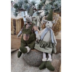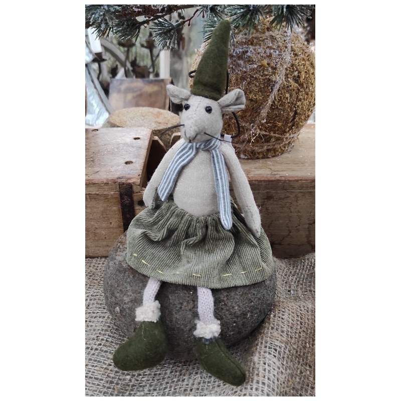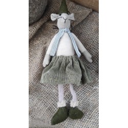 Söt större mustjej med välsydda kläder och tyngd i kroppen för en sittande ställning. Går även att hänga. Det finns även en muskille i samma storlek. Längd ca 25 cm.