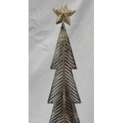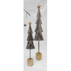 Julträd/granar i en avlång form i en metall som skiftar till gul/grönt. Foten är av trä och höjden är ca 42 cm och bredden ca 9 cm. Den finns i två storlekar och denna är den mindre